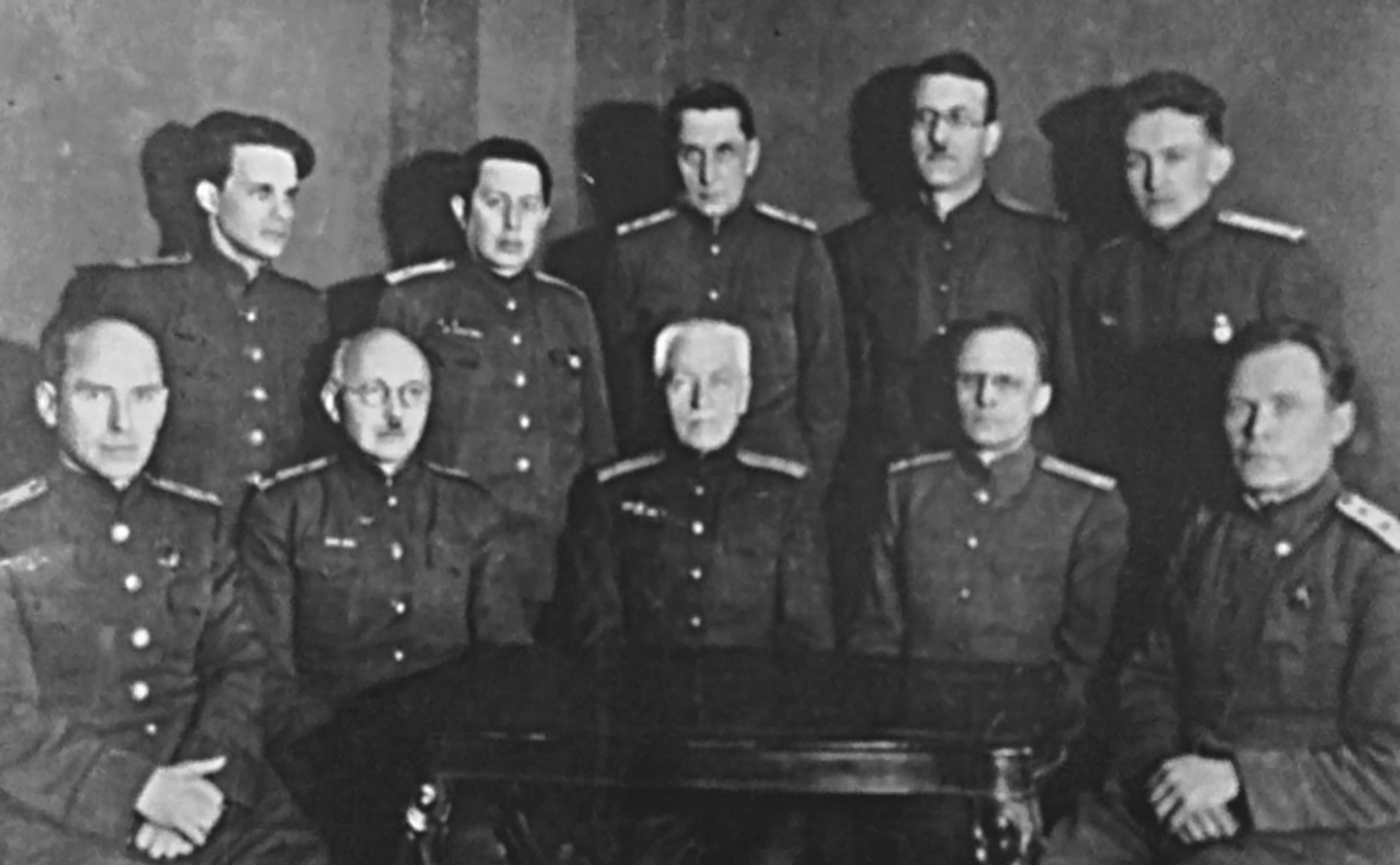 Fig. 4. Reception by K.E. Voroshilov, the People’s Commissar of Defense of the Union of Soviet Socialist Republics (USSR), of a group of Academy Professors M.I. Arinkin, N.N. Anichkov, E.N. Pavlovsky, V.N. Tonkov, A.G. Kuchariants, V.P. Osipov, L.A. Orbeli, and V.I. Woyachek, 1935.