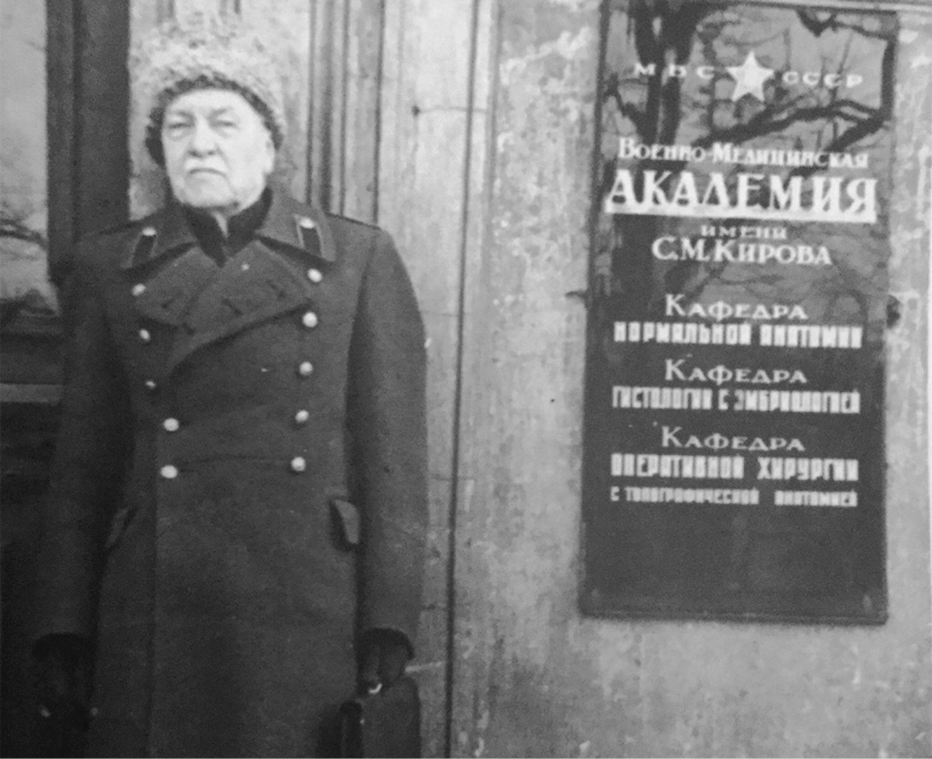 Fig. 10. Lieutenant General of the Medical Service V.N. Tonkov in the last years of his life at the entrance to the anatomical building