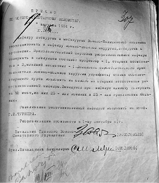В 1924 г. по решению совета академии кафедре ортопедии было предписано преподавание военно-полевой хирургии. Поэтому с 21 августа 1924 г. по 8 августа 1931 г. кафедра была переименована в кафедру военно-полевой хирургии, десмургии и ортопедии (приказ № 205 от 9 августа 1924 г. по Военно-санитарному ведомству) (рис. 3), а чтение этого предмета было поручено старшему ассистенту кафедры Э.Ю. Остен-Сакену, составившему соответствующие программы1.