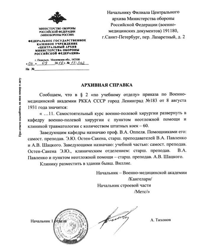 Fig. 4. Archival letter of verification about the content of the order of the Military Medical Academy of the Workers’ and Peasants’ Red Army (WPRA) of the USSR No. 183 dated August 8, 1931.