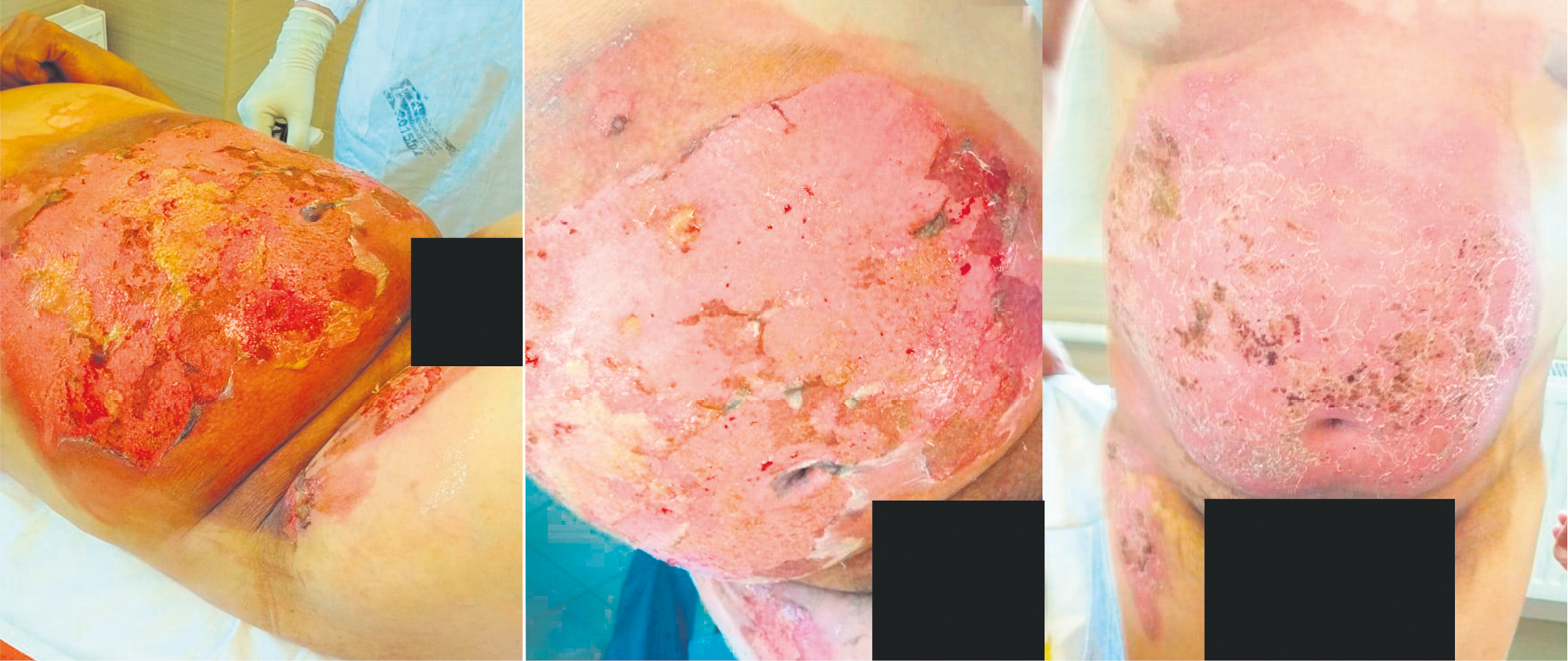 Рис. 1. Пациент А., 55 лет. Результаты лечения гелем редкосшитых акриловых полимеров с комплексом природных антимикробных пептидов FLIP-7: a — внешний вид раны — 1-е сутки; b — внешний вид раны — 4-е сутки; c — внешний вид раны — 7-е сутки лечения, полная эпителизация ожога