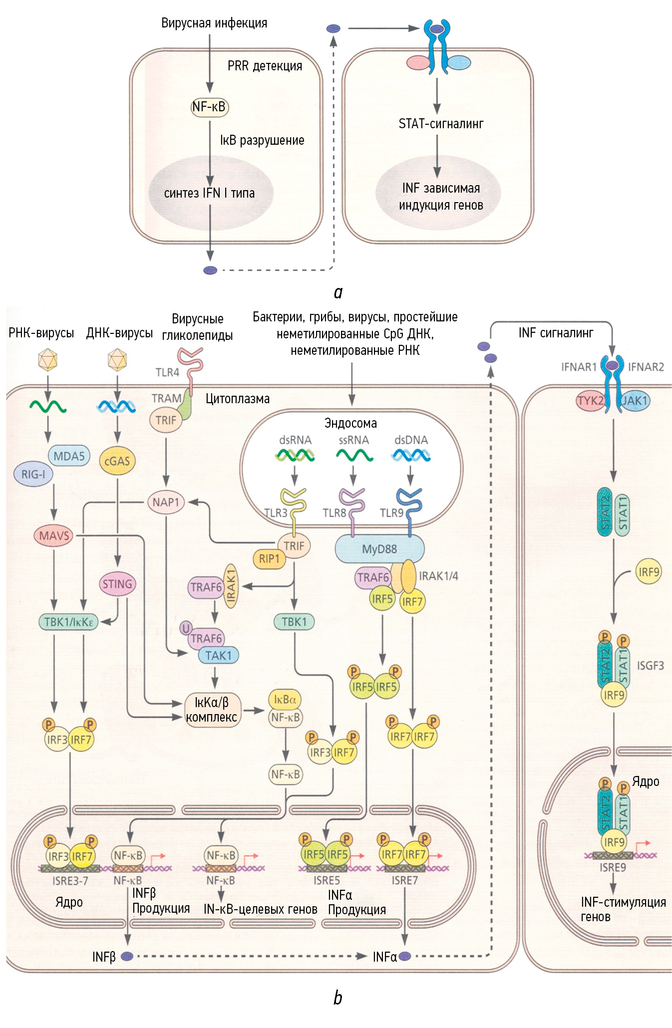Рис. 1. Синтез IFN I типа, секреция, связывание с рецепторами и трансдукция сигналов (по J. Flint, V. Racaniello, G. Rall et al., 2020): а — упрощенная схема синтеза IFN I типа и паракринной сигнализации, синтез генов, стимулируемых интерфероном; b — система обнаружения/сигнализации, приводящая к синтезу IFN. Вирусы или их компоненты связываются с TLR, которые запускают нисходящие сигнальные каскады, что приводит к секреции IFN I типа (α и β) и белков, регулируемых NF-kB. IFN I типа экспрессируются из клетки и затем связываются с рецепторами IFN на поверхностях соседних клеток, чтобы стимулировать синтез генов
