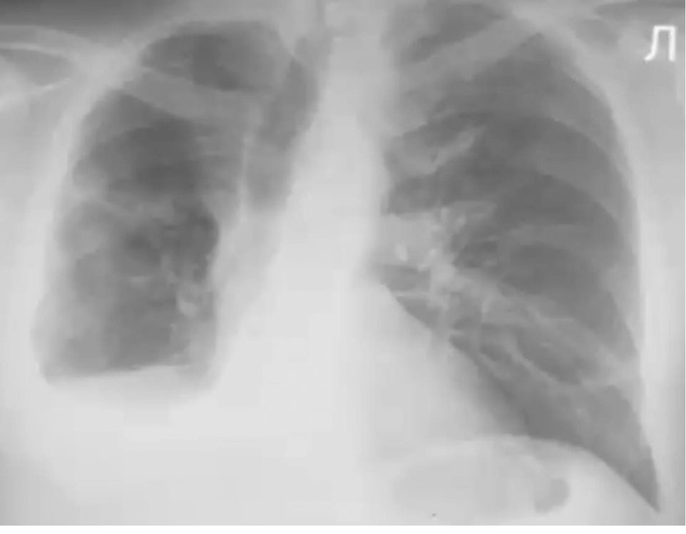 После окончания реабилитации был выполнен рентген-контроль (рис. 4). Очагов и фокусов уплотнения легочной ткани не определялось; сохранялось уплотнение и утолщение межуточной ткани в виде сетчатой и полисегментарной сетчато-тяжистой деформации легочного рисунка. Корень левого легкого уплотнен, культя правого не расширена.