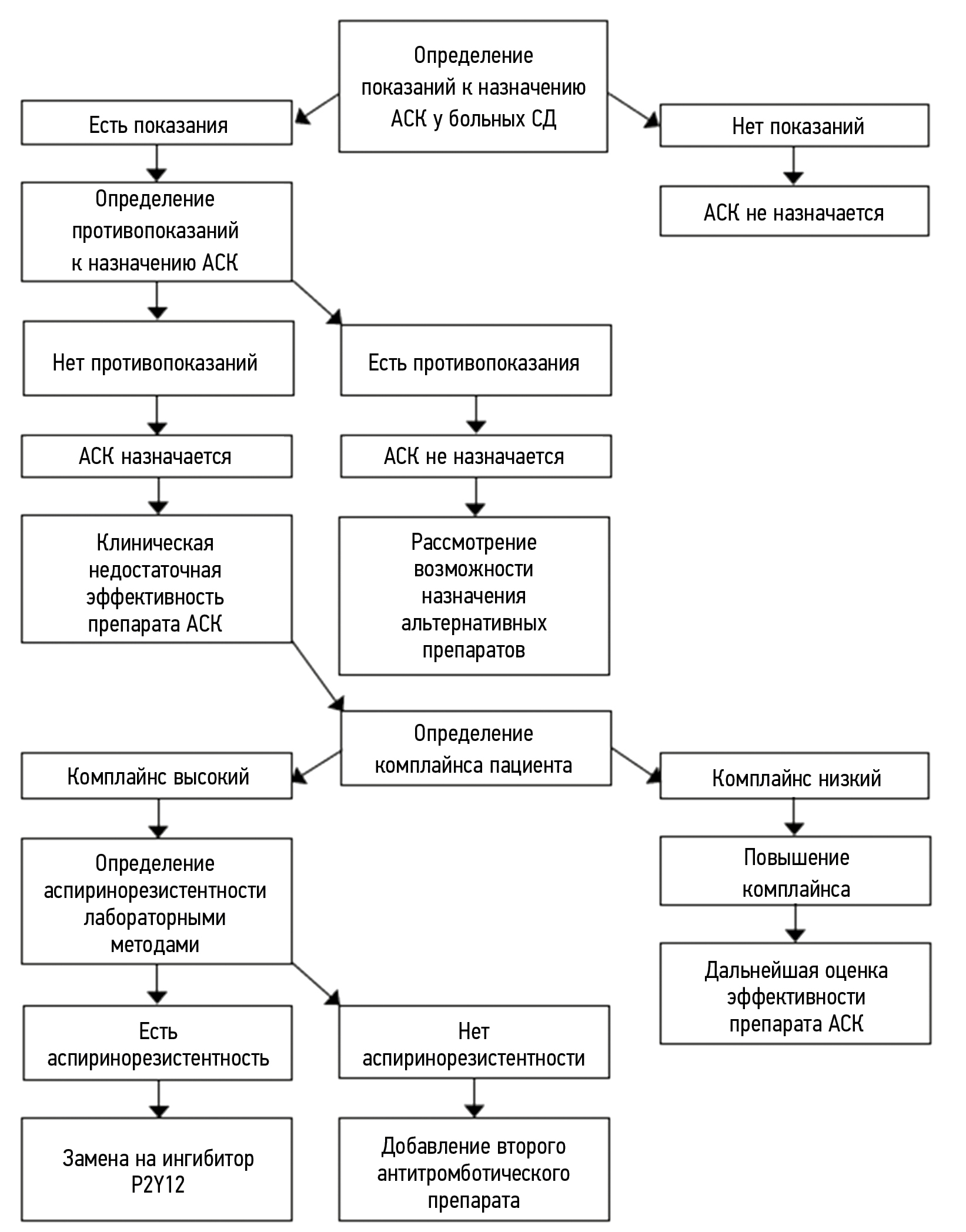Для своевременного выявления и преодоления аспиринорезистентности у пациентов СД, получающих терапию АСК, нами разработан и предложен следующий пошаговый алгоритм действий (рис.).