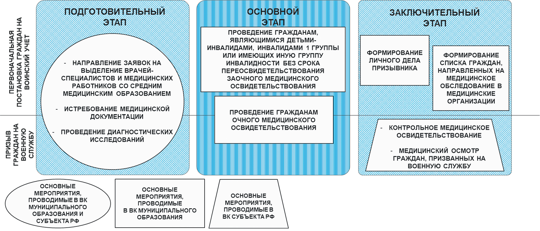 Организация первоначальной постановки граждан на воинский учет (ППВУ), призыва на военную службу граждан, не пребывающих в запасе, и воинского учета граждан, пребывающих в запасе, возложена на военные комиссариаты (ВК)4. Данные мероприятия предусматривают организацию и проведение медицинского освидетельствования5 (рис. 1) [1–3].