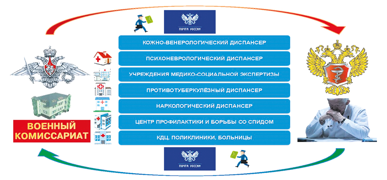 На подготовительном этапе при ППВУ и призыве граждан на военную службу ВК муниципального образования запрашивают сведения, характеризующие состояние здоровья граждан6 (медицинская документация) из медицинских организаций и федеральных государственных учреждений медико-социальной экспертизы (МСЭ)7. Запрашиваются сведения о гражданах, состоящих на учете по поводу психических расстройств, наркомании, алкоголизма, токсикомании, злоупотребления наркотическими средствами и другими токсическими веществами, инфицирования вирусом иммунодефицита человека, а также о гражданах, состоящих на диспансерном наблюдении по поводу других заболеваний8.