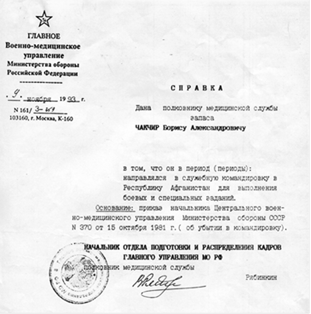 Рис. 1. Справка о командировании Б.А. Чакчира в Афганистан для выполнения боевых и специальных заданий