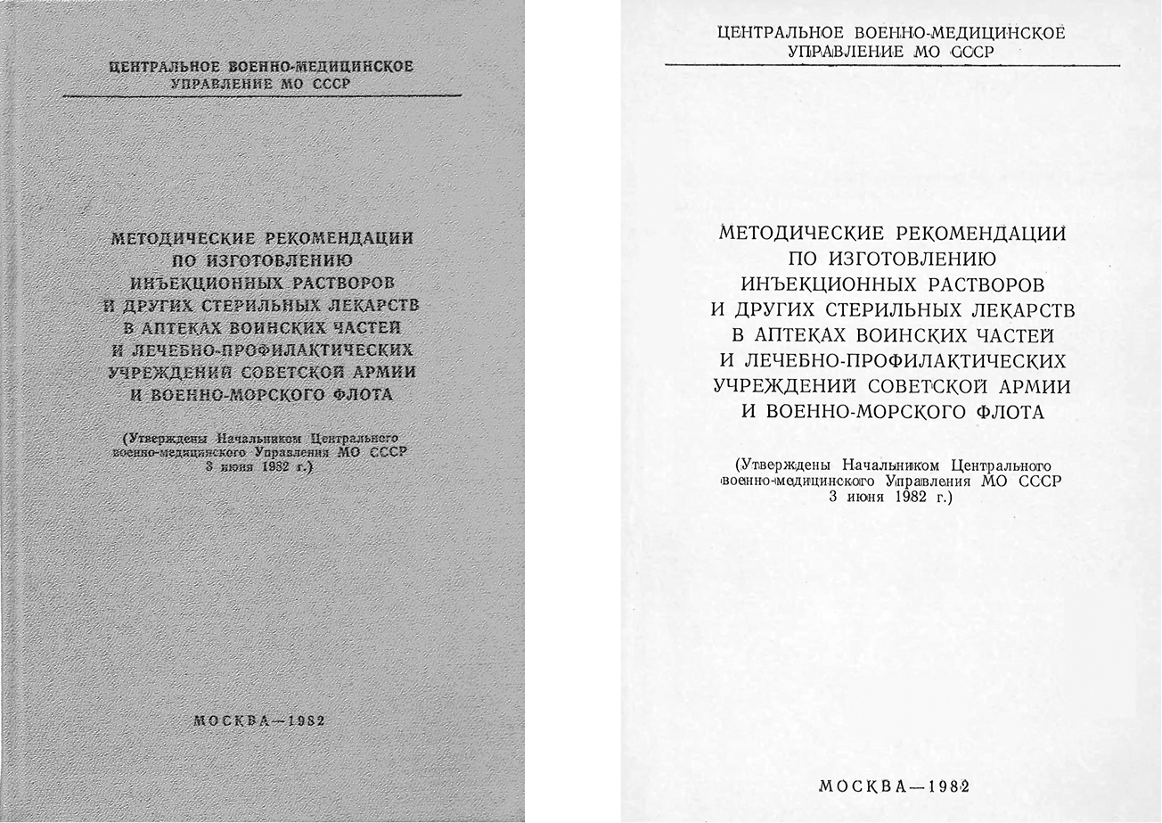 Рис. 3. Обложка и титульный лист «Методических рекомендаций по изготовлению инъекционных растворов…» (1982)