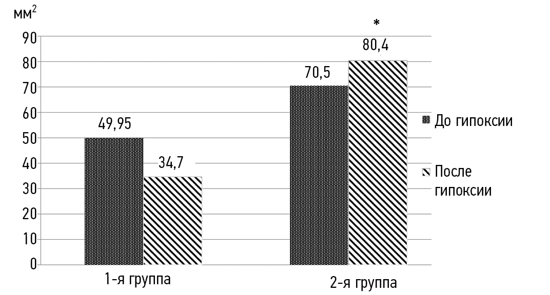 Во 2-й группе значимых изменений после гипоксического воздействия тоже не наблюдалось, но направленность их была иная, чем в 1-й группе. В 1-й группе уменьшались S, КФР при открытых глазах, во 2-й группе S и R увеличивались, КФР не изменялось. Вместе с тем в 1-й группе площадь перемещений центра давления при открытых глазах как до, так и после воздействия была очень небольшой, еще более уменьшаясь после гипоксии. Разница со 2-й группой стала статистически значимой после пробы (рис.).