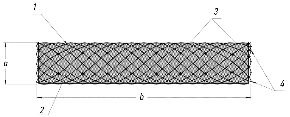Рис. 1. Один из рабочих вариантов чертежа основного ствола стент-графта: 1 — каркас стент-графта; 2 — наружная оболочка; 3 — крепления оболочки к каркасу; 4 — рентгеноконтрастные маркеры; а — диаметр стент-графта; b — длина стент-графта
