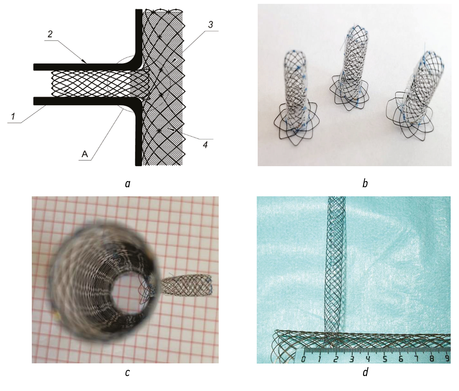 Рис. 2. Модуль отведения: а — рабочий чертеж бокового ответвления: 1 — модуль-ответвление; 2 — стенка отходящей артерии; 3 — каркасная сетка; 4 — оболочка стент-графта; b — опытные образцы модулей-отведений; c — опытный образец бокового отвода, ячейка 5 мм; d — опытный образец бокового отвода, ячейка 10 мм
