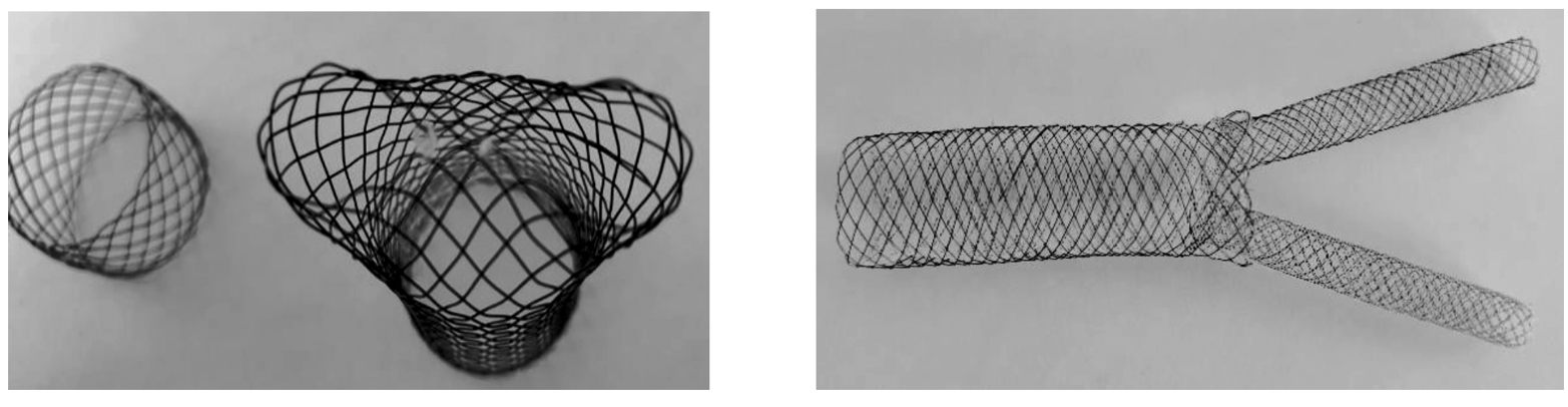 В качестве каркаса для разработки универсального стент-графта использовали плетеный саморасширяющийся стент из нитинола. Наружная оболочка стент-графта фиксируется к каркасу узловыми швами из небиодеградируемой хирургической нити. Каркас основного ствола графта выполнен в виде плетеной нитиноловой саморасширяющейся сетки с вариабельностью диаметра 20–50 мм и длиной 150–200 мм. Проксимальный и дистальный концы стент-графта отмечены рентгеноконтрастными маркерами. Ячейки имеют ромбовидную форму и изменяют свою конфигурацию в соответствии с диаметром аорты (рис. 1).