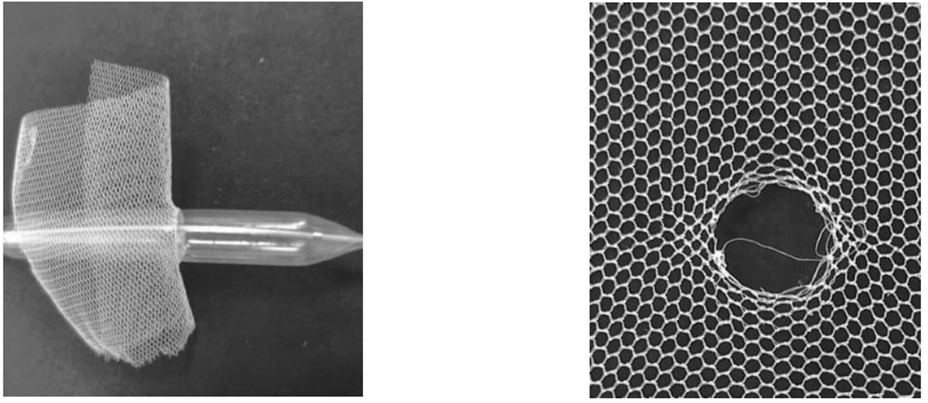 По результатам испытаний был выбран материал со следующими параметрами: волокнистые или монофиламентные нити, толщиной от 0,05 до 0,1 мм, скрученные попарно и сплетенные в цепочку. Сплетенные нити дополнительно формируют сетку с 6–8-угольными ячейками, с условным диаметром 0,3–0,5 мм. Толщина получившегося материала не превышает 0,2 мм. Во время баллонной дилятации отмечались разрывы одной-двух нитей материала, без образования «стрелок». За счет характера плетения порванные нити плотно стягивались петлями «цепочек» по периметру отверстия.