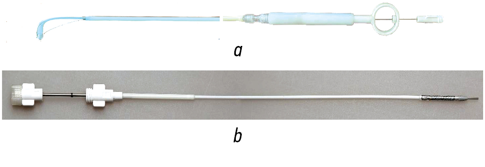 Рис. 8. Сопутствующие устройства: а — пример катетера с перфоратором, изогнутым под необходимым углом; b — сложенный модуль-отведение в системе доставки