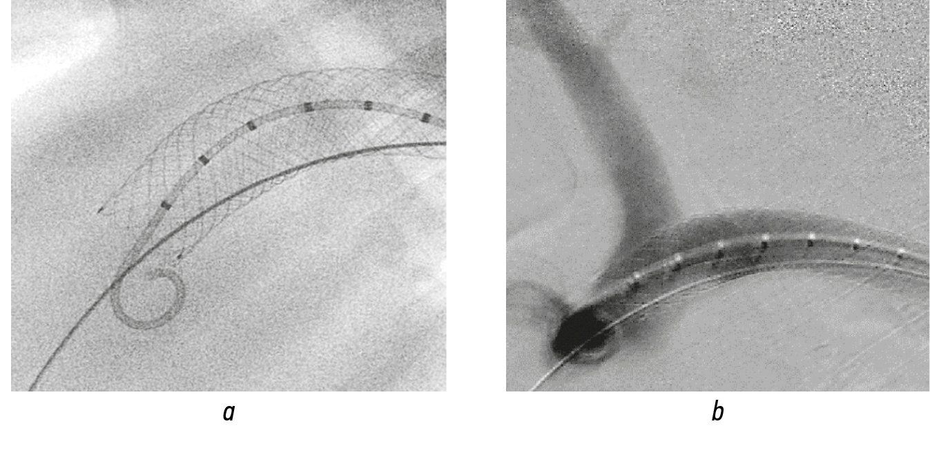 Рис. 12. Эндопротезирование дуги аорты: а — стент-графт имплантирован в дугу аорты; b — контрольная ангиограмма плечеголовного ствола