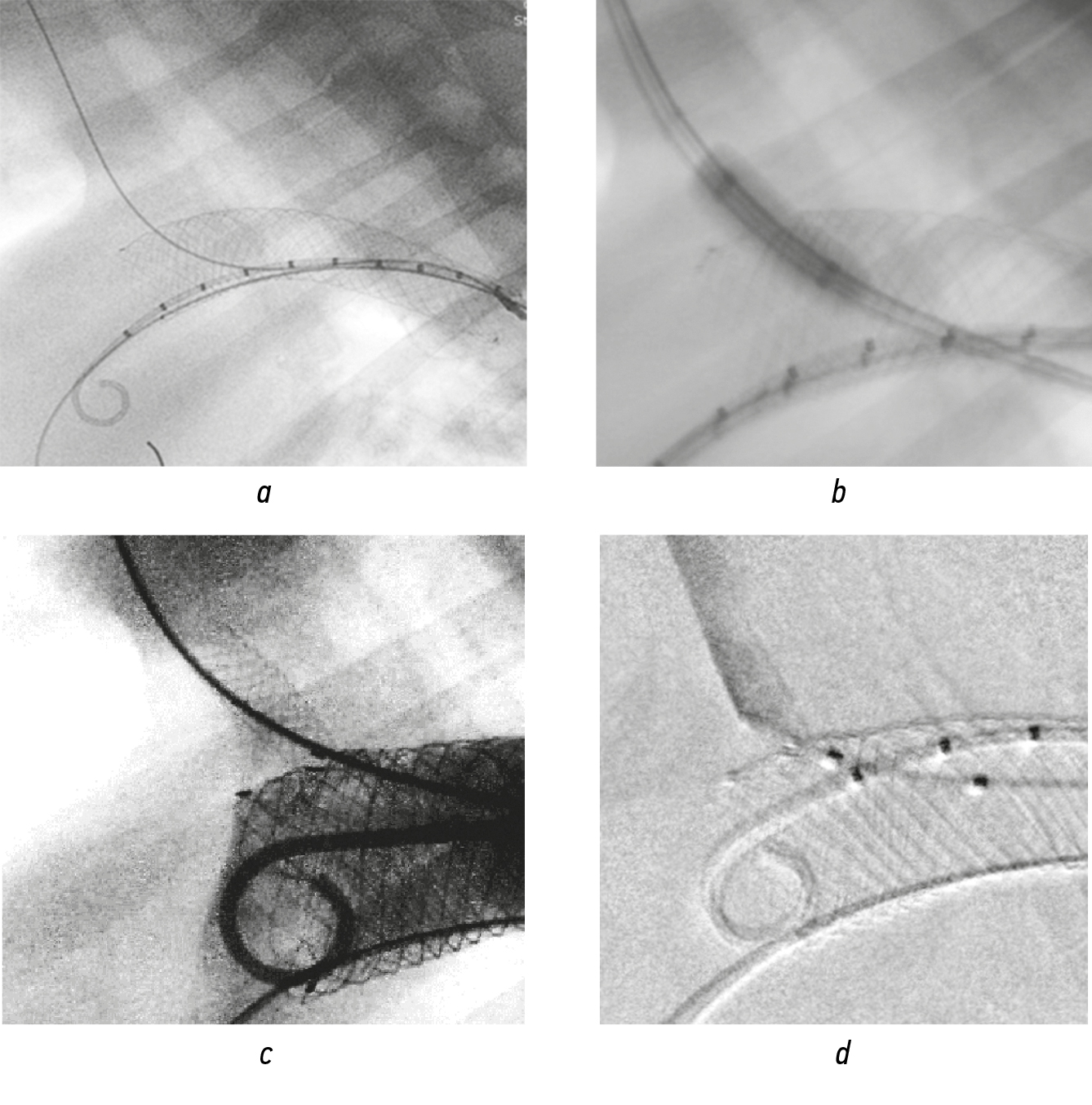 Рис. 13. Этапы бранширования стент-графта, имплантированного в дугу аорты: а — персонифицированная фенестрация стенки графта; b — баллонная дилятация фенестрации; c — отводящий модуль в устье плечеголовного ствола; d — контрольная ангиограмма