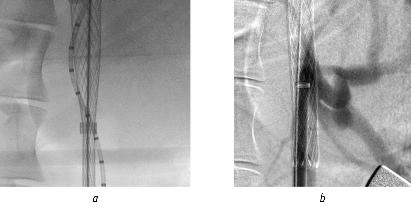Рис. 14. Эндопротезирование супраренального отдела аорты: а — имплантация основного ствола; b — контрольная ангиограмма
