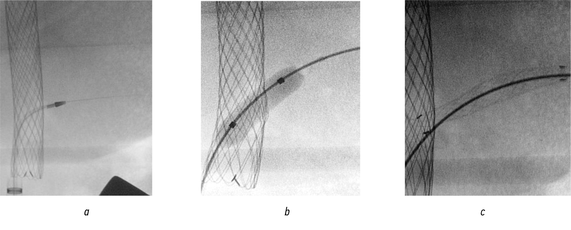 Методика установки стент-графта. Установку предлагаемого стент-графта при эндопротезировании аневризм аорты осуществляли при помощи оригинальной системы доставки на фоне применения гепарина и ретгеноконтрастного вещества (омнипак). Устройство доставляли к месту установки, по сверхжесткому проводнику, предварительно установленному в аорте через его ствол до устья ветви аорты. Позиционирование осуществляли в режиме RoadMap по рентгеноконтрастным меткам на модуле. Фенестрацию стенки основного ствола стент-графта выполняли гидрофильным проводником напротив устья перекрытой ветви аорты. Такой способ фенестрации исключал необходимость выполнения у пациента дополнительных хирургических доступов в периферические отделы вовлеченных сосудов. Следующим шагом через фенестрированную стенку в отходящую артерию по проводнику заводили и раскрывали модуль-ответвление с обязательной постдилатацией баллонным катетером. После чего баллон и проводник удаляли. Важно отметить, что такой способ бранширования использовали для каждой перекрытой магистральной ветви. Гепаринизацию пациента и сохранение эндолика IV типа продолжали до окончания установки всех необходимых модулей.