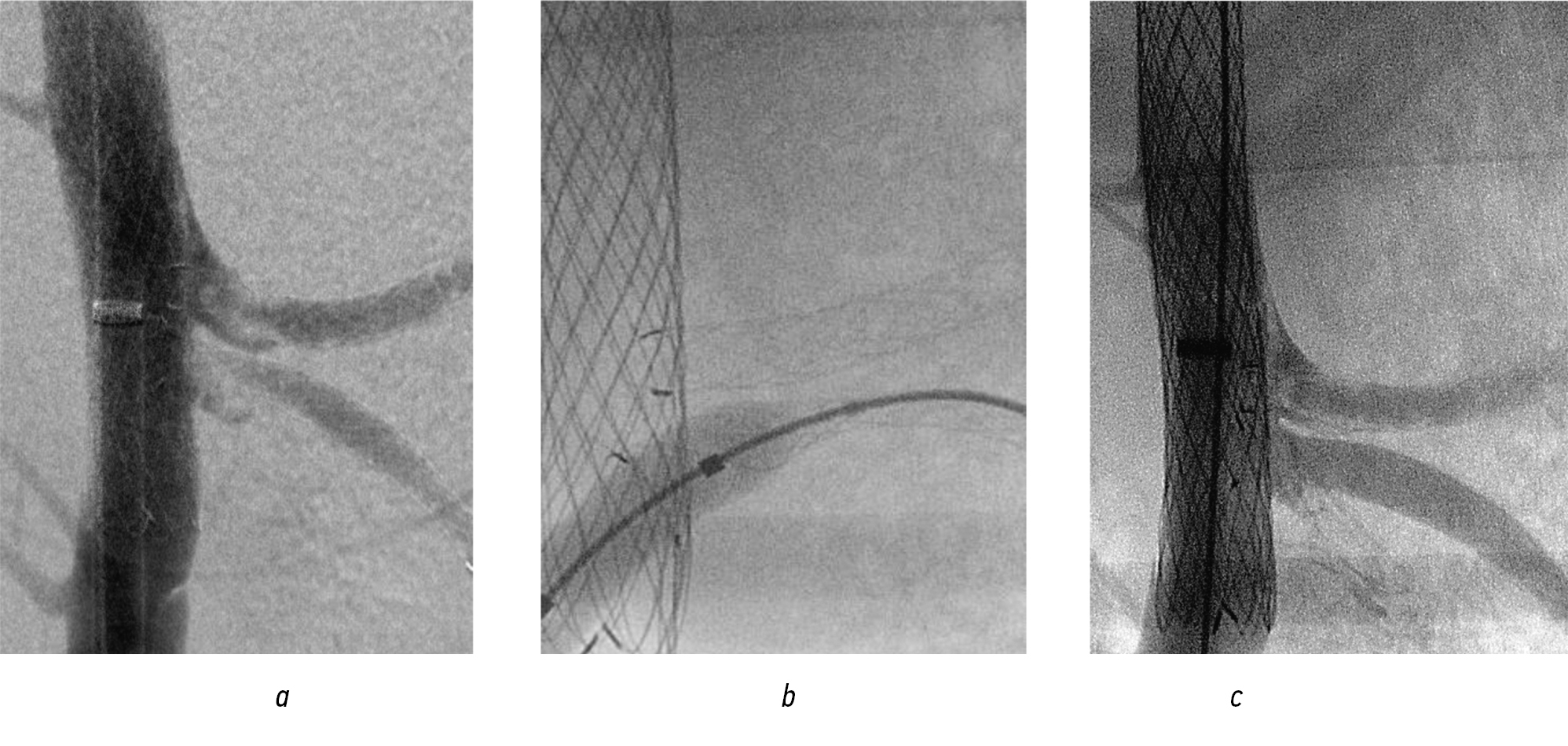 Рис. 17. Ангиограммы после протезирования висцеральных ветвей: a — контроль после имплантации; b — постдилятация модулей; c — контрольный снимок