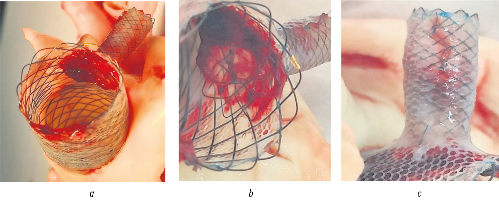 Выявлено, что оптимальным для наружной оболочки изделия является лавсановое полотно (полиэтилентерефталат), в основе которого монофиламентные нити толщиной до 0,1 мм, двойного плетения, с диаметром ячеек 0,5 мм. Испытание опытных образцов стент-графтов на стенде, симулирующем модель артериального кровотока, показало, что материал оболочки разработанного устройства обладает гепарин-контролируемой хирургической пористостью от 50 до 150 мл/мин/см2 при давлении 120 мм рт. ст. с возможностью сохранения управляемого эндолика II типа. На фоне гепарина стенка графта создает градиент давления 3–5 мм рт. ст., а скоростные показатели потока вполне достаточны для адекватной перфузии жизненно важных органов и создания рентгенологической «дорожной карты» на фоне применения ретгеноконтрастного вещества, что необходимо для точной фенестрации и дальнейшего протезирования магистральных ветвей аорты.