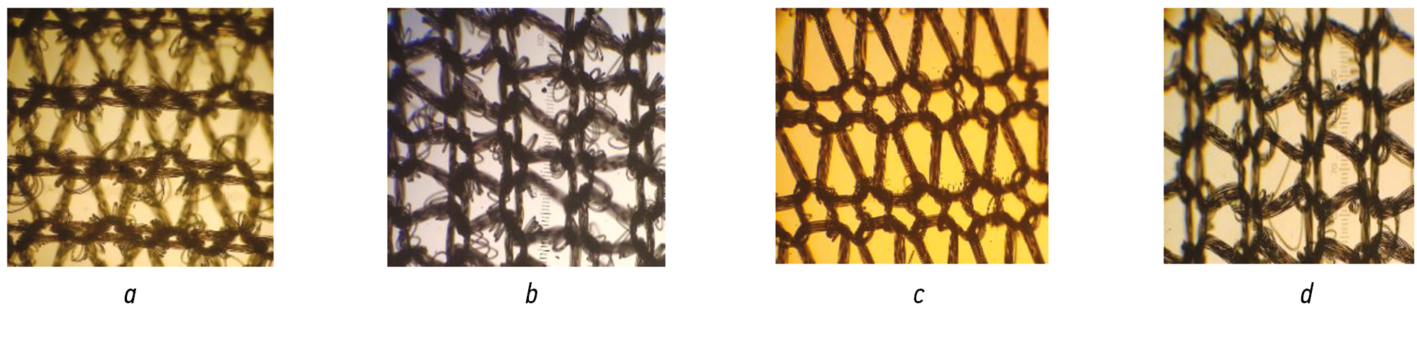 Рис. 4. Анализ микроструктуры лавсана: a и b — лавсан с высокой тромбогенностью и ригидностью; c и d — образец, удовлетворяющий требованиям проекта (низкая ворсистость нитей и особенность растяжимости). Микрофотографии (ув. × 40)