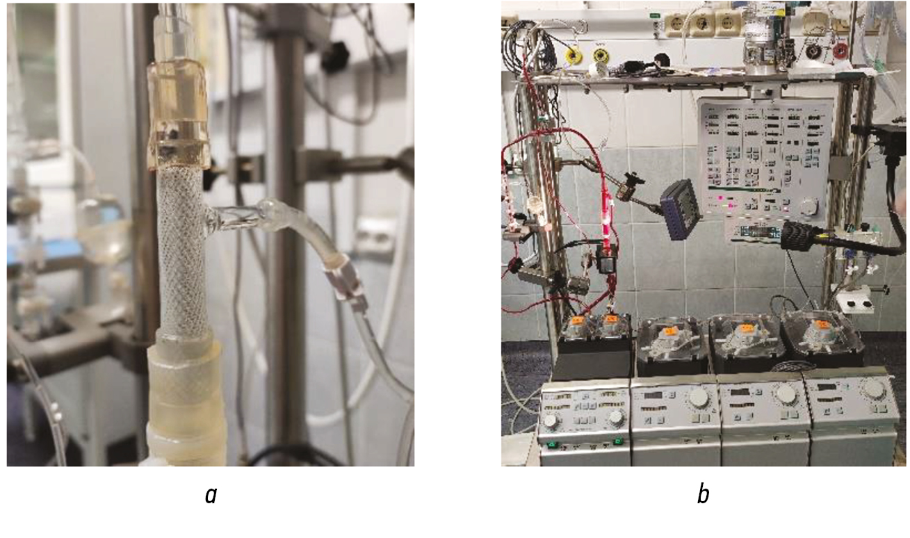 Рис. 6. Симуляционная модель артериальной системы с артериальным кровотоком: а — опытный стент-графт внутри модели сосуда; b — стенд на базе аппарата искусственного кровообращения «MaquetHL20»