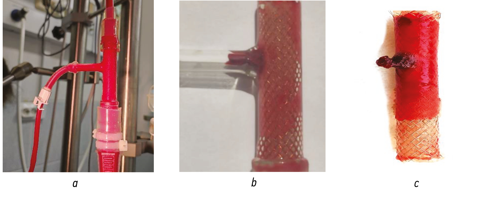Рис. 7. Оценка гепарин-контролируемой хирургической пористости стенки на симуляционной модели: а — образец в контуре на этапе гепаринизации; b — герметизация контура после введения протамина сульфата; с — извлеченный образец после дегепаринизации