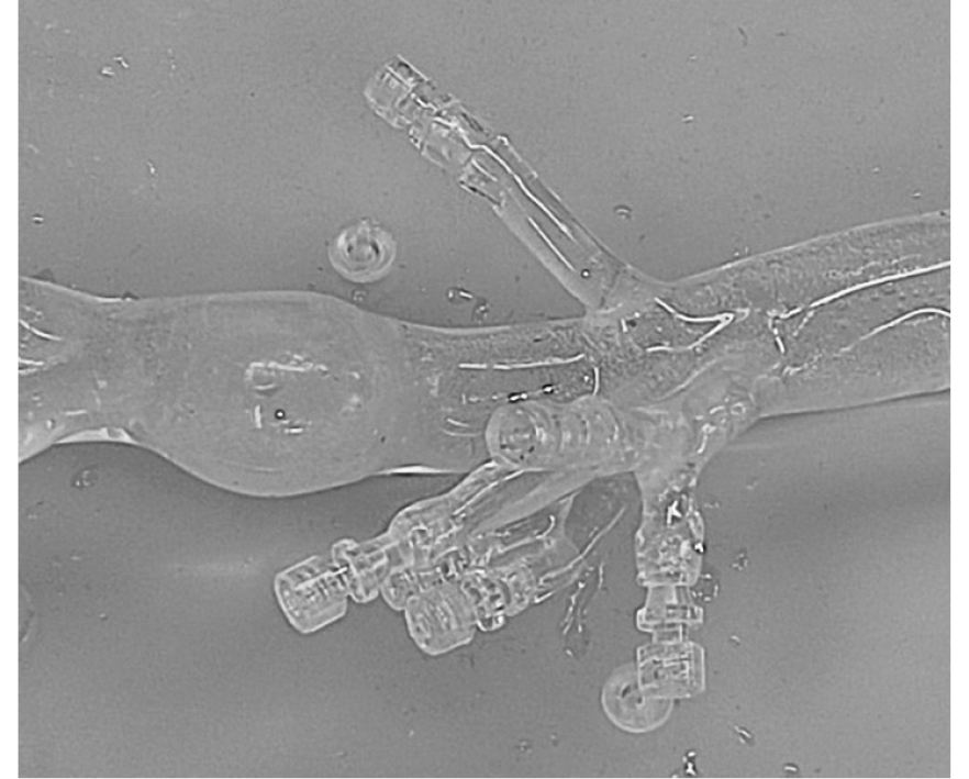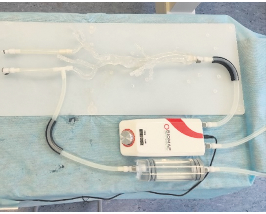 Контур силиконового фантома аорты заполнили кровезаменяющим раствором, моделирующим реологические свойства нативной крови. С помощью перфузионного насоса был создан пульсирующий кровоток с максимальным давлением 200 мм рт. ст. (рис. 10).