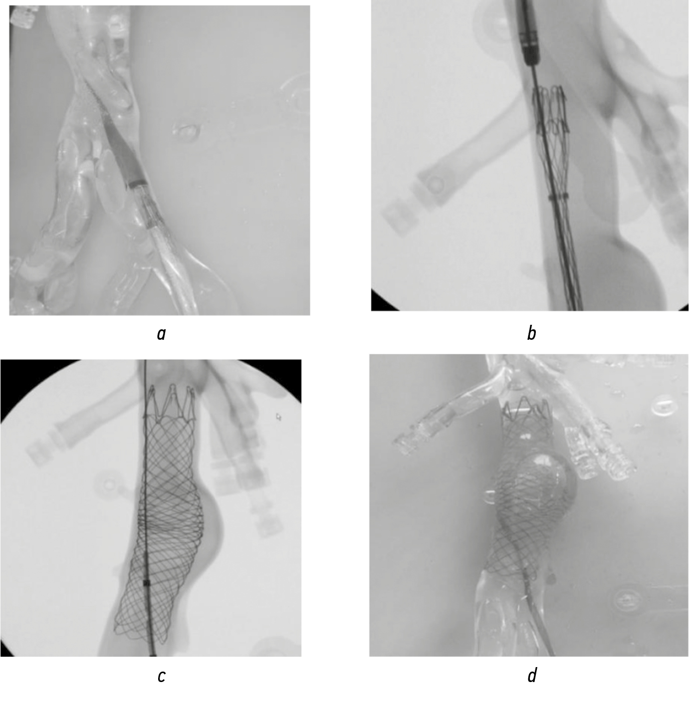 Рис. 11. Этапы имплантации стент-графта: а — стент-графт в системе доставки заведен в модель брюшной аорты; b — система спозиционирована ниже устьев почечных артерий (модель); c — стент-графт имплантирован в зону аневризмы; d — внешний вид изделия, имплантированного в силиконовую модель аневризмы брюшной аорты