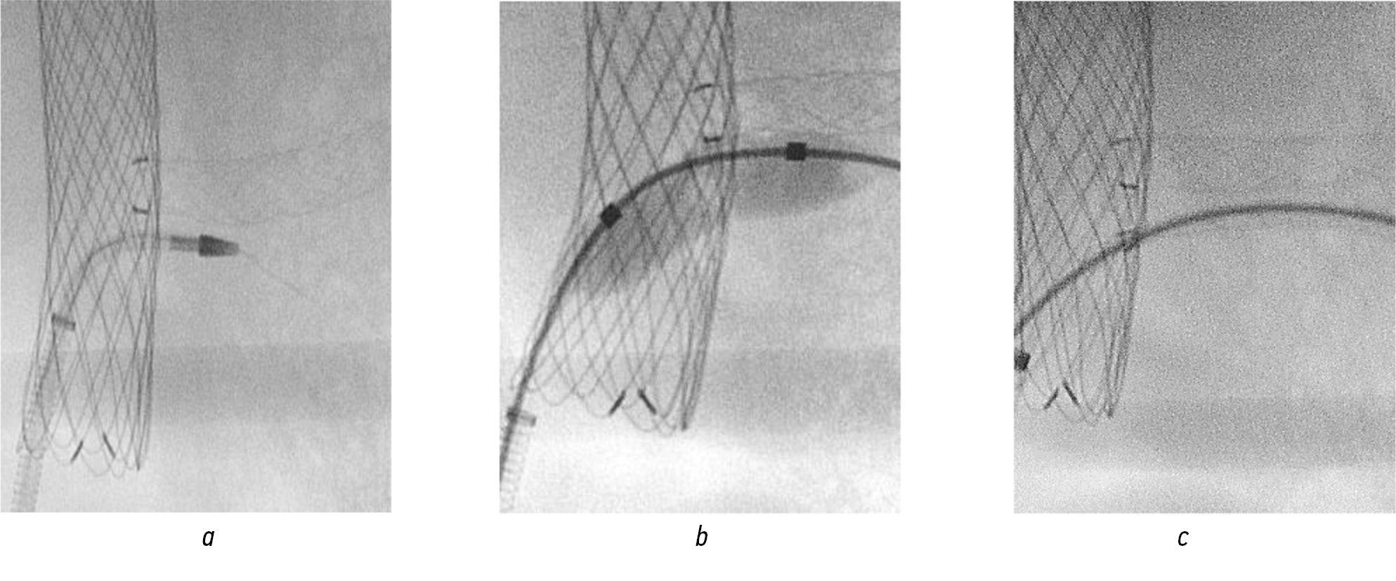 Рис. 16. Этапы эндопротезирования супраренального отдела аорты (продолжение): а — персонифицированная фенестрация над устьем верхней брыжеечной артерии; b — баллонная дилатация фенестрационного отверстия; c — имплантация модуля в верхнюю брыжеечную артерию