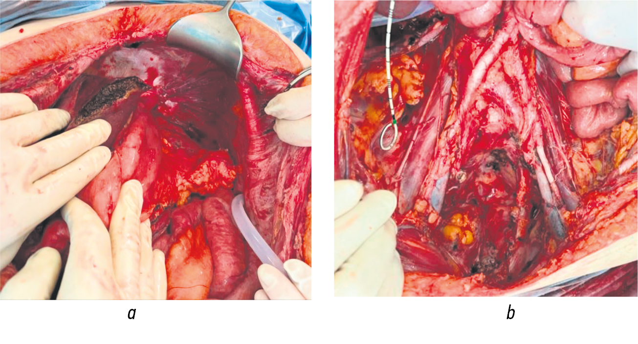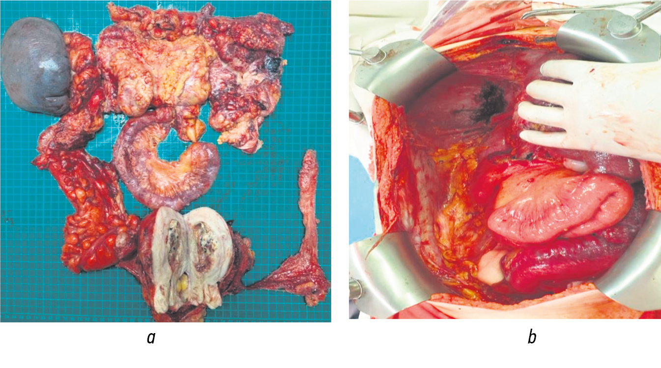 Рис. 1. Рак яичников, осложненный субкомпенсированным нарушением проходимости тонкой и толстой кишок (а). Некроз местнораспространенной опухоли прямой кишки канцероматоза брюшины (b)