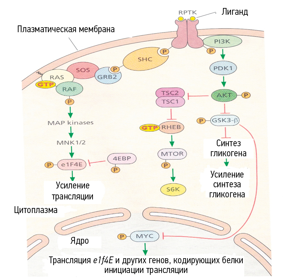 Активация инициируется связыванием лиганда с рецепторным белком тирозинкиназы (receptor protein tyrosine kinase — RPTK). Передача сигналов через RAS (белковые протоонкогенные продукты, участвуют в стимуляции клеточного деления, связаны с плазматическими мембранами клеток) и каскад MAP активируют МАРК сигнал-взаимодействующие киназы (MAPK signal-interacting kinase 1, 2 — MNK1, 2), которые фосфорилируют и активируют инициацию трансляции белка eIF4E. Активность этого инициирующего белка также повышается при передаче сигналов от RPTK через фосфатидилинозитол-3-киназу (phosphatidylinositol 3-kinase — PI3K) и 3-фосфоинозитид зависимую протеинкиназу 1 (3-phosphoinositide-dependent protein kinase — PDK1), что стимулирует протеинкиназу В (ингибирует процессы апоптоза, принимает участие в регуляции клеточного цикла, индуцирует синтез белка и поэтому является ключевым белком, регулирующим рост тканей, отвечает за развитие мышечной гипертрофии). Поскольку продукт гена Akt1 блокирует апоптоз, повышенный уровень экспрессии Akt1 отмечается во многих опухолях. Первоначально Akt1 был охарактеризован как онкоген. Сегодня известно, что продукты гена Akt1 блокируют апоптоз, а его повышенные уровни отмечаются в различных опухолях. Эта киназа инактивирует туберозный склерозный комплекс (tuberous sclerosis complex — TSC1/2) и активирует малый G-белок — RHEB (Ras homology enriched in brain) и mTOR (mammalian target of rapamycin). mTOR фосфорилирует ингибирующий 4EBP (eIF4E-связывающий белок), подавляет его способность инактивировать eIF4E. Транскрипция генов, кодирующих eIF4E, других белков инициации трансляции, стимулируется при фосфорилировании гликогенсинтазы киназы β (glycogen synthase kinase β — GSK3β) активированной AKT (АКТ — англ. V-akt murine thymoma viral oncogene homolog 1 (название дано по источнику выделения из клеток мышей, которым была привита тимома, т. е. лимфома тимуса, представляет собой серин-треониновую киназу) и снимает ингибирование транскрипционного активатора MYC (семейство регуляторных генов и протоонкогенов, кодирующих транскрипционные факторы). Семейство Myc состоит из трех родственных генов человека: c-myc (MYC), l-myc (MYCL) и n-myc (MYCN). АКТ-зависимое фосфорилирование рибосомального белка S6 киназы (ribosomal protein S6 kinase — S6K) увеличивает скорость и удлиняет время трансляции. Эти механизмы увеличивают доступность и активность белков, имеющих решающее значение в выборе соответствующей скорости, необходимой для роста клеток. АКТ своими сигналами также регулирует метаболизм посредством фосфорилирования и инактивации GSK3β и влияния активированного mTOR на липидный обмен [7, 8].