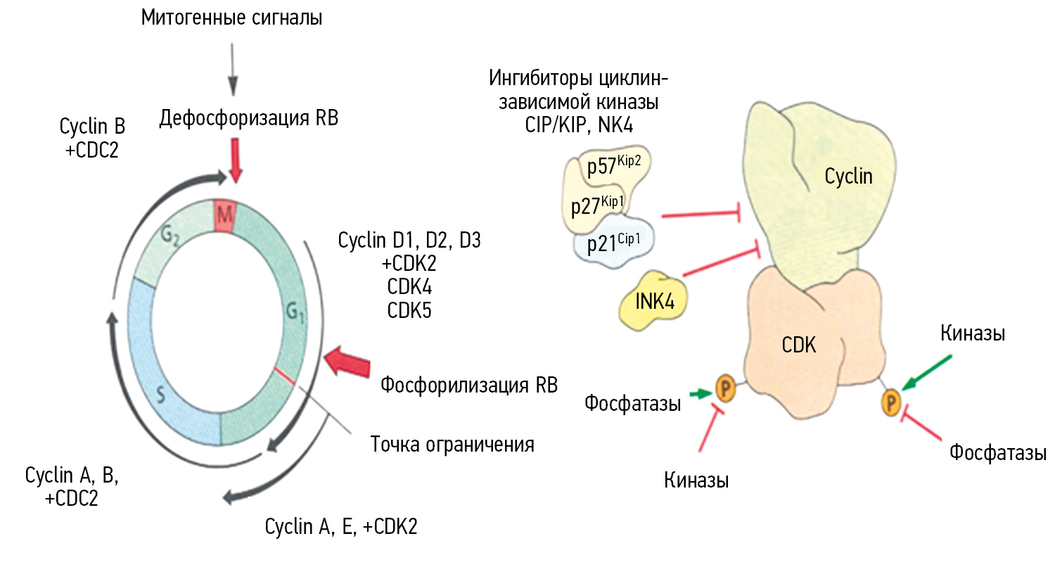 Активация киназ может сопровождаться не только связыванием с соответствующим циклином, но и фосфорилированием определенных участков и удалением фосфатных групп. Так, фосфорилирование остатков Thr и Tyr киназами WEE1 и MYT ингибирует активность нескольких циклин-зависимых киназ (cyclin-dependent kinase — CDK) и блокирует прогрессирование клеточного цикла до тех пор, пока остатки не будут дефосфорилированы фосфатазами семейства CDC25. Активность киназ также контролируется членами двух семейств CDK-ингибирующих белков: INK4-белки контролируют активацию только G1, а CIP/KIP-белки — все остальные CDK. Оба типа ингибиторов играют решающую роль в контроле клеточного цикла. Так, высокая концентрация p27kip1 характерна для покоящихся клеток, а переход клеток в фазу G1 сопровождается снижением концентрация этого белка, ингибирование его синтеза препятствует переходу клеток в фазу покоя (рис. 2) [10].