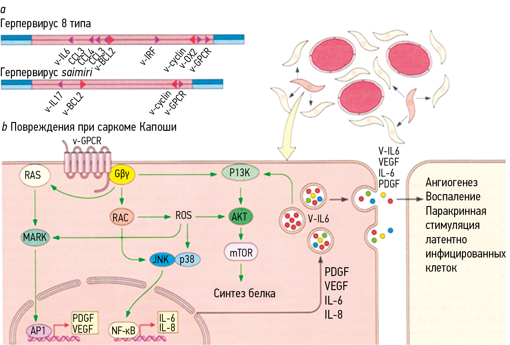 Домен SH4 различных вирус-трансформирующих белков содержит сайт для миристиновой кислоты, закрепляющей белок в клеточной мембране. Домены SH2 и SH3 опосредуют белково-белковые взаимодействия, связывая фосфотирозинсодержащие и богатые пролином последовательности, участвуя таким образом в сигнальных трансдукционных путях и фосфорилируя белок Y527. Трансдуцированные онкогены — гомологи клеточных генов кодируют компоненты сигнальной трансдукции. Так, геном вируса герпеса человека (ВГЧ) 8-го типа содержит гомологи различных клеточных генов. Вирусный геном кодирует белки, необходимые для репродукции и сборки вирусных частиц. Гомологи клеточных генов находятся между основными генными блоками. Одни связаны с клеточными хемокинами (v-IL-6, v-IL-17, CCL-3, 4), хемокиновыми рецепторами (v-GPCR) — другие с сигнальными молекулами (интерферон-чувствительным белком (interferon-responsive protein — v-IRF), трансмембранным белком семейства N-CAM, участвующим в межклеточной сигнализации v-OX2). v-IL-6, v-IRF блокируют эффекты интерферона. Вирусные гены, ассоциированные с клеточными генами, кодируют белки (v-cyclin, v-BCL-2), регулирующие пролиферацию клеток и апоптоз. Инфицированные клетки ВПГ 8-го типа секретируют v-GPCR, v-IL-6. Продукция инфицированными клетками v-FLIP способствует их выживанию и латентному течению инфекции, а секреция v-ciclin — пролиферации. Литическое течение инфекции сопровождается цитотоксическими эффектами, поэтому была предложена паракринная модель онкогенеза (рис. 3).