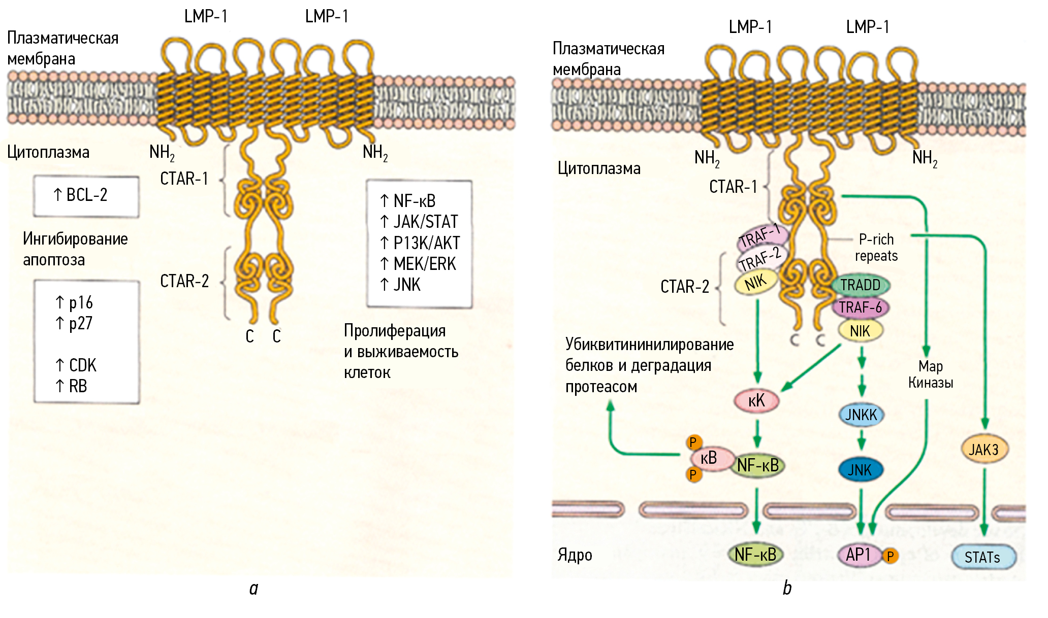 Рис. 4. Конститутивная активация клеточной мембраны белком 1 вируса Эпштейна — Барр: а — краткое описание транскрипционных и других регуляторов, которые стимулируются или подавляются передачей сигналов от LMP-1; b — LMP-1 олигомеризуется в отсутствие лиганда. При локализации на плазматической мембране С-концевой сегмент LMP-1, с которым связываются клеточные белки, активирует клеточные транскрипционные регуляторы и увеличивает продолжительность жизни В-клеток. Длинный цитоплазматический С-концевой домен вирусного белка участвует в активации сигнализации (CTAR) 1 и 2. Как показано, несколько членов семейства белков, ассоциированных с рецепторами фактора некроза опухоли (TRAF), связываются с CTAR-1, что приводит к активации протеинкиназы NIK (NF-KB-индуцирующая киназа) и IkK (Ik-киназа) и, в конечном счете, NF-kB. Домен CTAR-2 LMP-1 также индуцирует активацию NF-kB через ассоциацию с TRADD и TRAF-6. Он также отвечает за активацию AP-1 через путь JUN N-концевой киназы (JNK). Кроме того, TRAF-связывающий домен CTAR-1 индуцирует активацию каскада киназы MAP, в то время как богатая пролином область необходима для активации JAK3 и STATs. Эти реакции на LMP-1 необходимы для трансформации фибробластов крыс (по J. Flint, Vincent R. Racaniello, G. Rall, Th. Hatzoocannon, 2020)