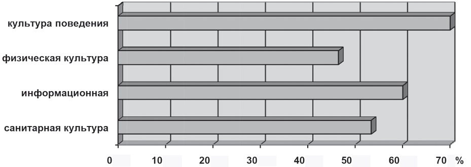 Анализ медицинской культуры потребителей медицинских услуг кардиологического профиля проводился по следующим параметрам: санологическая культура, физическая культура, информационная культура, культура поведения. Под санологической культурой понимается уровень усвоения норм и принципов сохранения и укрепления здоровья. Информационная культура – это уровень усвоения норм и правил работы с информацией, связанной с сохранением и укреплением здоровья, а также ее использования. Культура поведения – это уровень усвоения норм и правил поведения, принятых в обществе, в ходе получения медицинских услуг по сохранению, укреплению и восстановлению здоровья. Физическая культура – это степень усвоения человеком духовных и материальных ценностей с целью укрепления здоровья и совершенствования двигательной активности.