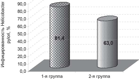Представляет интерес оценка инфицированности Helicobacter pylori при помощи быстрой уреазной пробы и последующего анализа гистологических препаратов. При этом обращает на себя внимание факт более высокой степени инфицированности (81,4%) у лиц 1-й группы по сравнению с КГ (63%; р<0,05), рис. 3.