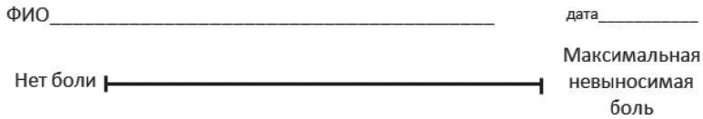 Пациентам предлагалось сделать на линии отметку, соответствующую интенсивности испытываемой ими боли. Начальная точка линии обозначает отсутствие боли – 0, затем идет слабая, умеренная, сильная, конечная, невыносимая боли – 10. Расстояние между левым концом линии и сделанной отметкой измерялась в миллиметрах и для удобства подсчета переводилась в баллы (10 мм = 1 балл) [11].