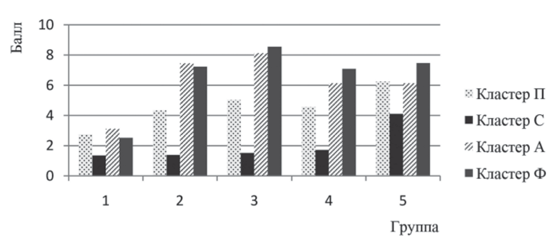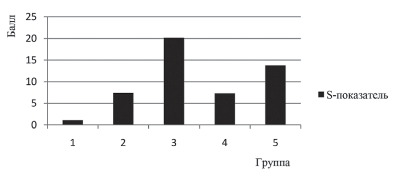 Рис. 5. Структура S-показателя в отдельных кластерах при исследовании СПСАФД после завершения стоматологической реабилитации и адаптации к зубопротезным конструкциям