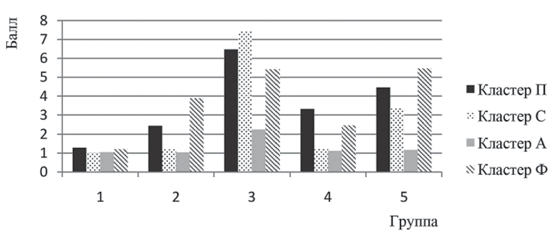 Установлено, что пациенты 1-й, 2-й и 4-й групп после завершения стоматологической реабилитации в меньшей степени, чем до нее, были озабочены имеющейся у них утратой естественных зубов и в связи с этим, нарушением функции жевания, которую удалось устранить различными зубопротезными конструкциями. Благоприятный исход стоматологической реабилитации, устранившей эстетический дефект лица (кластер А), а также существенно улучшивший функцию жевания (кластер Ф), благоприятно повлиял на выраженность отдельных симптомов, входящих в кластер П (рис. 5).