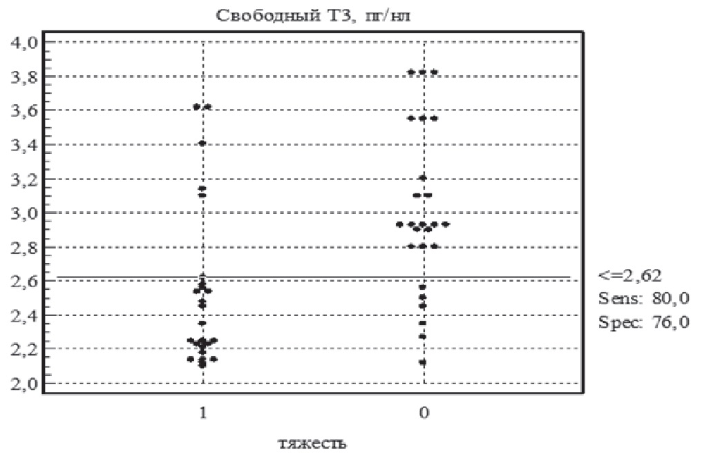 Из представленных на рисунке 1 данных видно, что наилучшее сочетание чувствительности и специфичности определяется при уровне свободного трийодтиронина 2,62 пг/мл. Характеристики прогностической значимости при пороговом значении свободного трийодтиронина, равного 2,62 пг/мл, представлены в таблице 2.