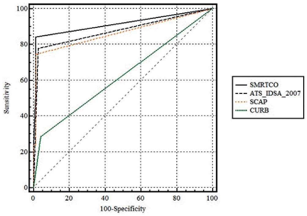 При использовании шкалы ATS/IDSA 2007 у лиц с тяжелым течением ВП чувствительность и специфичность данной шкалы составила 77,42 и 91,84% соответственно. При этом AUC составила 0,75 у. е.