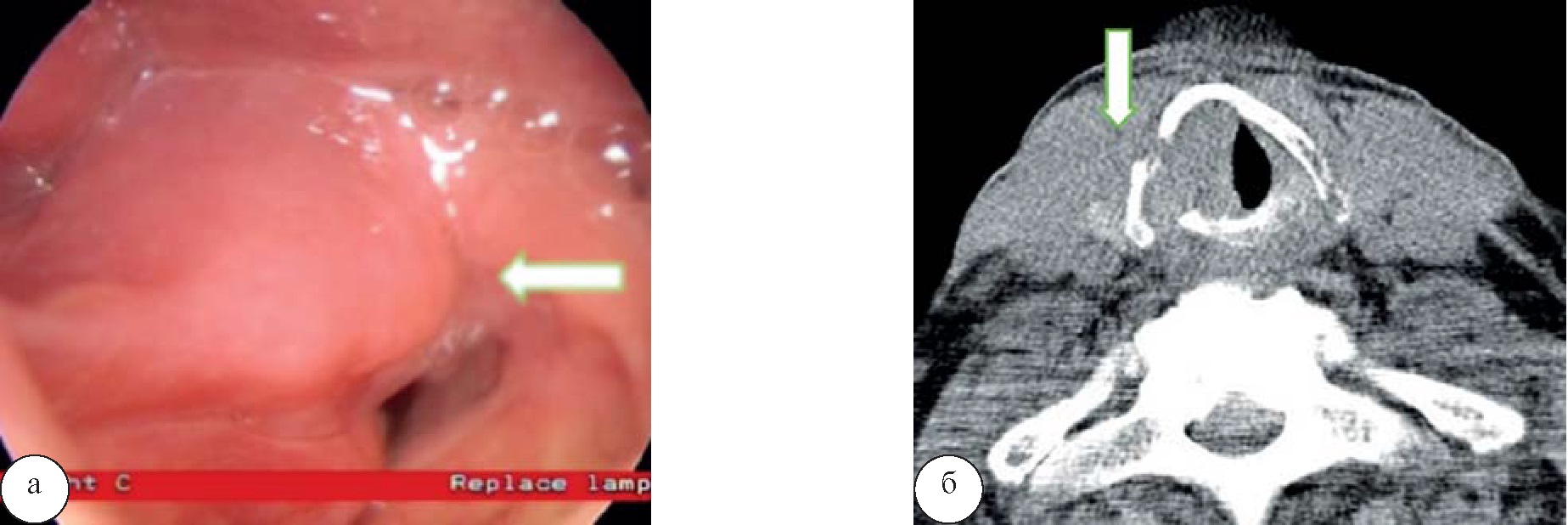 Рис. 1. Рак гортани. При ларингоскопии (а) отмечается крупное образование правой половины гортани (стрелка). При компьютерной томографии (б) определяется крупное мягкотканное образование правой половины гортани без четких контуров, инфильтрирующее правую голосовую складку с распространением на переднюю и заднюю комиссуру, инфильтрирующее прилежащие мягкие ткани справа, вызывающее деструкцию щитовидного, перстневидного и правого черпаловидного хрящей