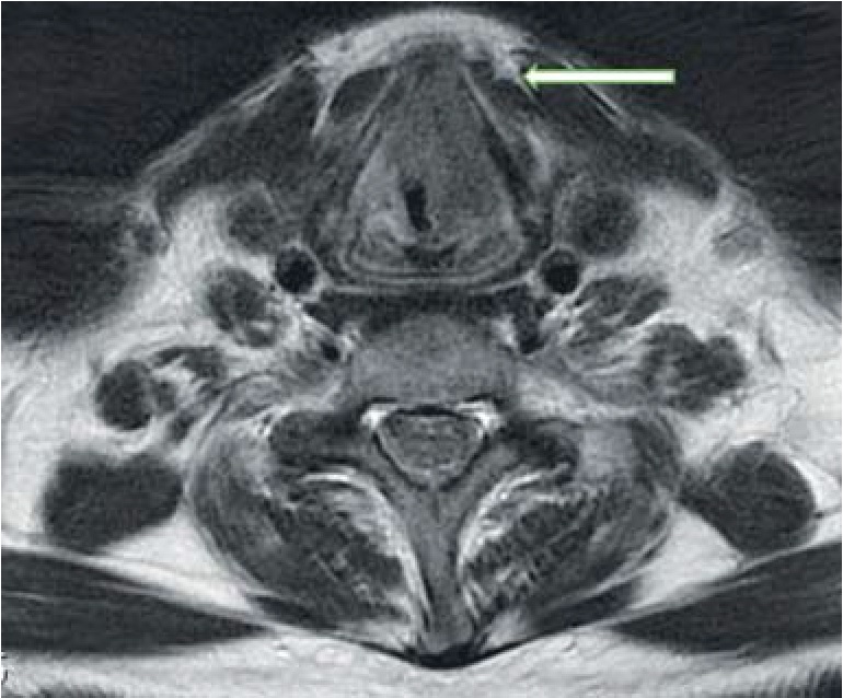 Рис. 2. Рак гортани. При МРТ на Т2-ВИ определяется новообразование левой половины гортани с распространением на передние отделы щитовидного хряща