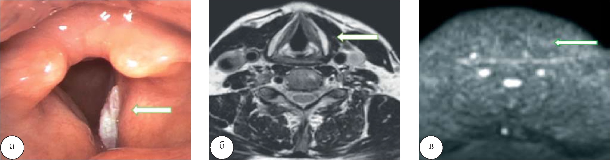 Рис. 3. Высокодифференцированный рак гортани. При эндовидеоларингоскопии (а) в области правой голосовой складки определяется образование, покрытое фибрином. При МРТ на Т2-ВИ (б) и на ДВИ (в) данных за образование голосовых складок не получено