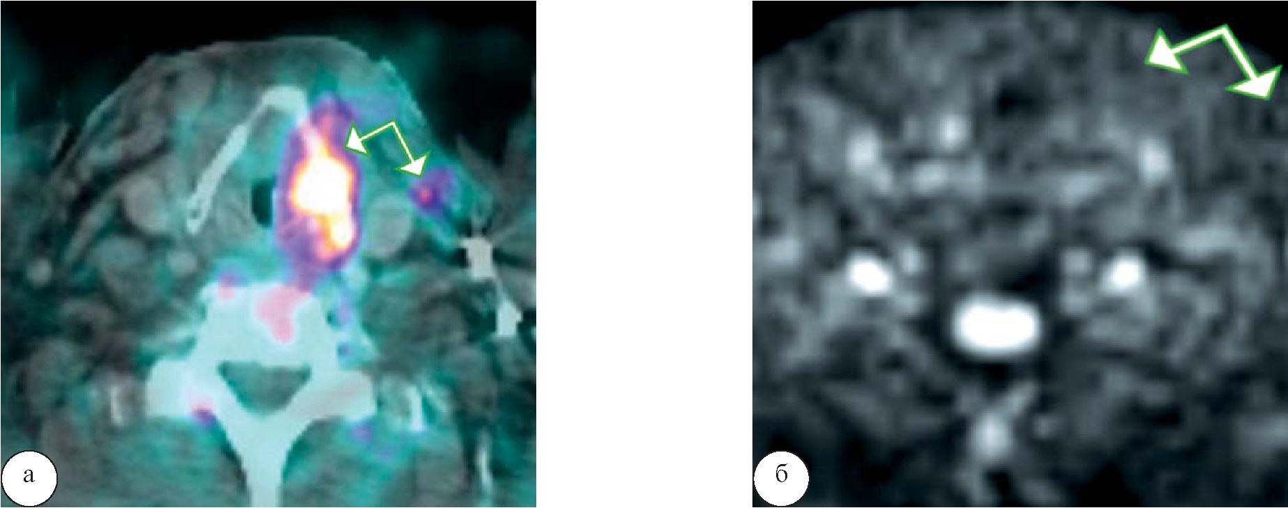 Рис. 4. Высокодифференцированный рак гортани с метастазированием в регионарные лимфатические узлы. При ПЭТ/КТ (а) определяется образование в области левой голосовой складки и лимфатический узел III группы слева с повышенным уровнем метаболизма 18-ФДГ, однако при МРТ на ДВИ (б) повышения сигнала в области образования и в области лимфатического узла не отмечается