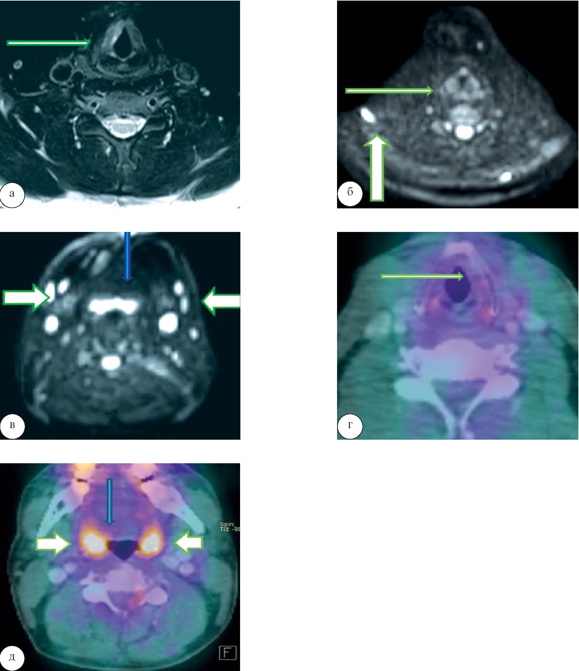Рис. 5. Воспалительные изменения правой голосовой складки. При МРТ на Т2-ВИ определяется гиперинтенсивное образование правой голосовой складки (а), характеризующееся отсутствием повышенного сигнала на ДВИ (тонкая белая стрелка) с визуализацией повышенного сигнала в области множественных лимфатических узлов Ia, Ib, IIa, IIb, III, Va групп с обеих сторон (б, в) (толстые стрелки) и в области лимфоидного кольца Пирогова – Вальдейера (голубая стрелка). На ПЭТ/КТ-изображениях (г, д) гиперметаболизма глюкозы в области образования правой голосовой складки не прослеживается (тонкая белая стрелка), в области шейных лимфатических узлов прослеживается небольшой уровень захвата РФП (толстые д стрелки) и повышенный уровень захвата воспалительного характера в области миндалин (голубая стрелка)