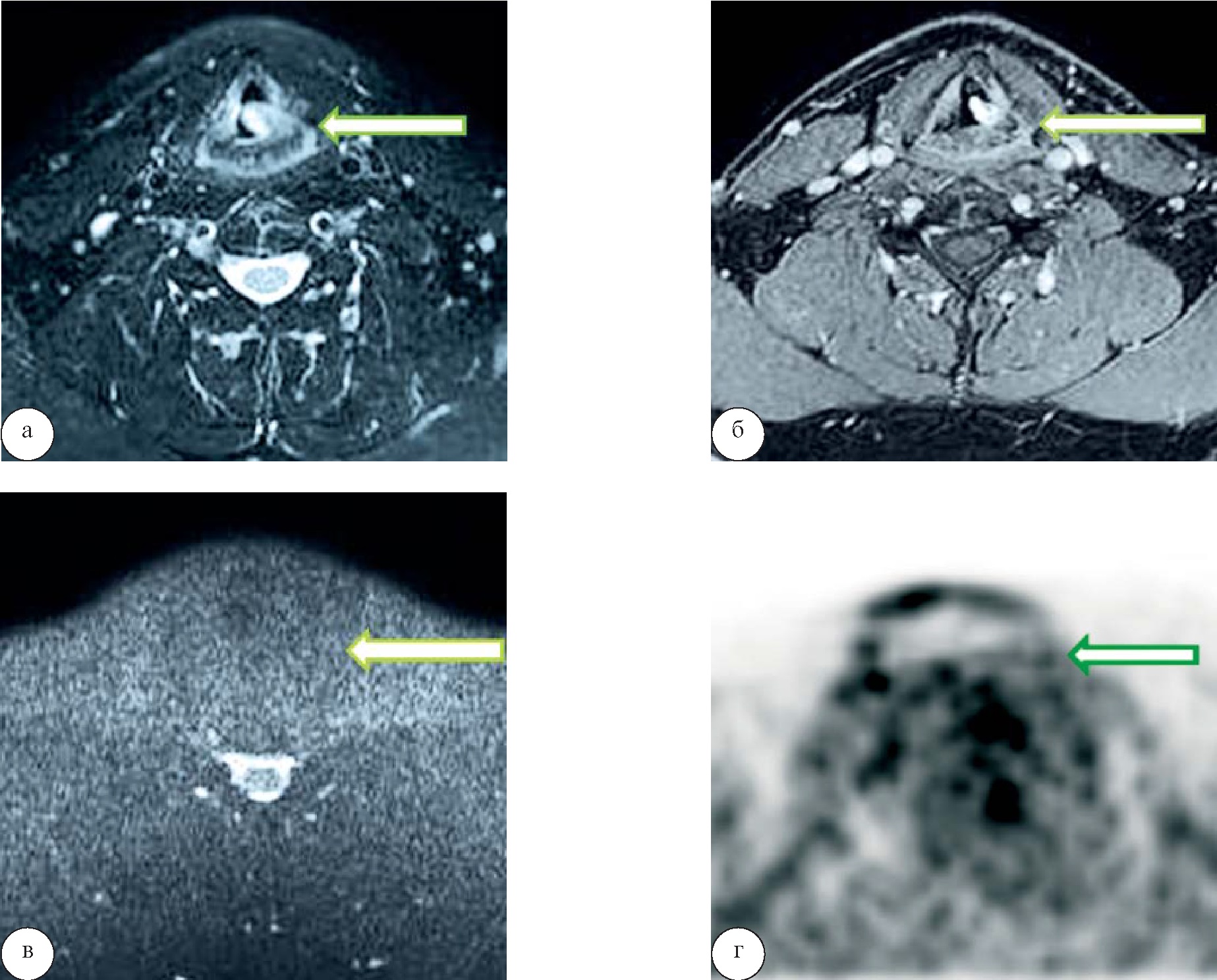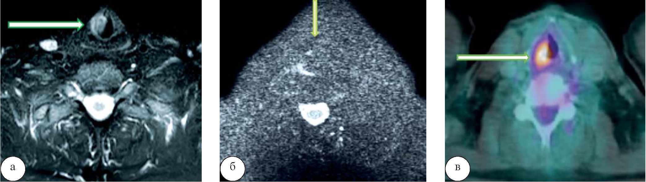 Использование в клинической практике таких высокотехнологических методов, как компьютерная томография (КТ) и магнитно-резонансная томография (МРТ), значительно повысило эффективность выявления рака гортани, регионарных метастазов, стадирования онкопроцесса [4–9]. Однако в ряде случаев оба лучевых метода не позволяют ответить на вопрос о злокачественности выявленного образования, а трудность в дифференцировке воспалительного и неопластического процесса приводит к ложноположительным результатам в выявлении метастазов в лимфатические узлы при выполнении МРТ-исследования. Также для проведения МРТ существует множество ограничений – наличие кардиостимулятора, металлических инородных тел, крупные размеры пациента, клаустрофобия, длительность протоколов, а следовательно, наличие двигательных артефактов, гиперсаливация [4].