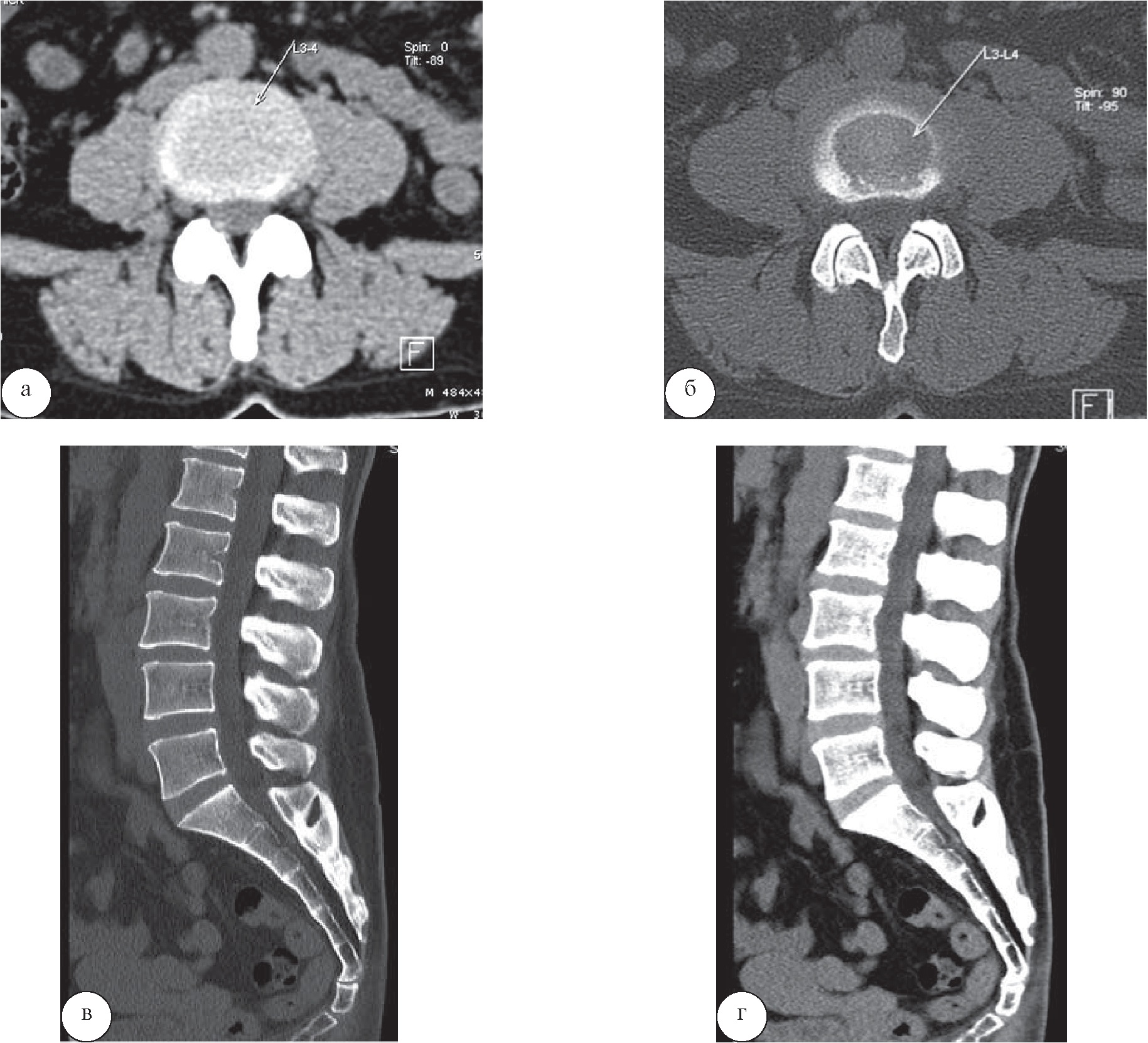 Рис. 1. Пациентка Т., 44 года. На КТ поясничного отдела позвоночника в аксиальной (а, б) и сагиттальной плоскостях (в, г) определяются остеохондроз поясничного отдела позвоночника I степени, протрузии межпозвонковых дисков L4–5 и L5–S1, не превышающие 3 мм, спондилоартроз, передний дегенеративный спондилолистез позвонка L3 I степени (менее 1/4 ширины позвонка) без признаков дегенеративного сужения позвоночного канала и выраженной нестабильности