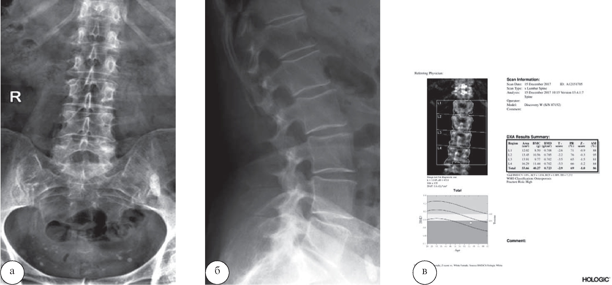 Рис. 2. Пациентка Т., 56 лет с проявлениями остеохондроза пояснично-крестцового отдела позвоночника. При рентенографии пояснично-крестцового отдела позвоночника в прямой и боковой проекциях (а, б) определяются умеренные проявления остеохондроза поясничного отдела позвоночника. При выполнении остеоденситометрии (в) площадь сканируемой поверхности (Area) – 55,66 см2. Содержание костного минерала (BMC) – 40,27 г, проекционная минеральная плотность костной ткани (BMD) – 0,723 г/см2, Т-критерий= –2,9, Z-критерий = –1, минерализация костей поясничного отдела позвоночника – в пределах значений остеопороза